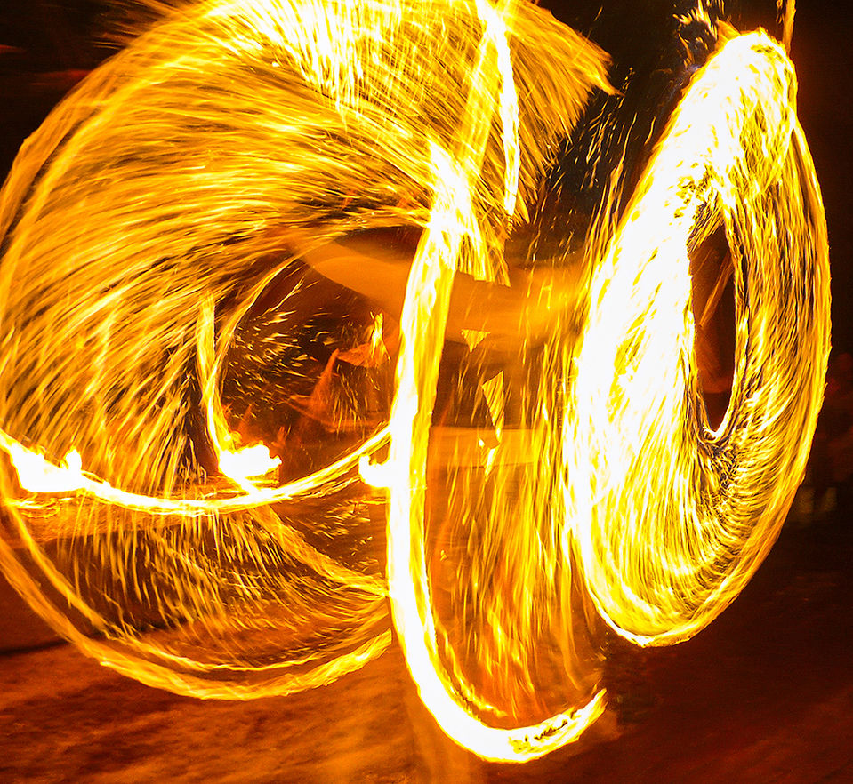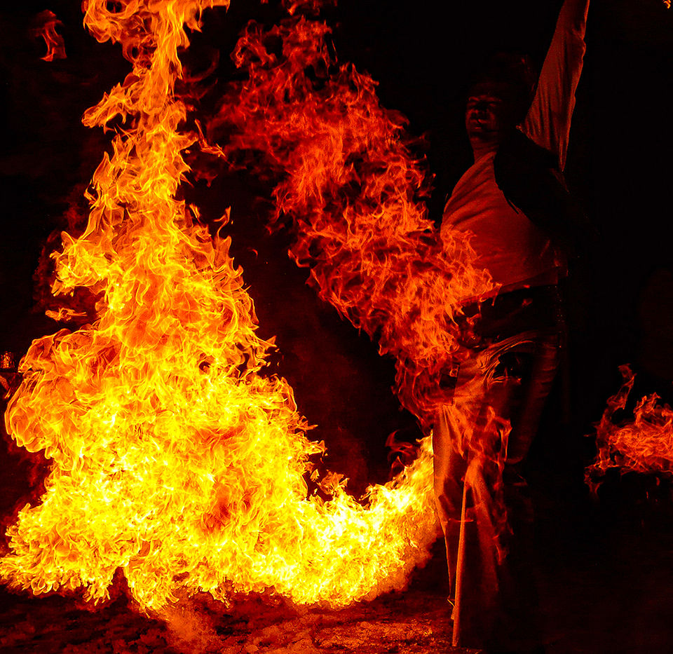 Die Feuermenschen lieben das Spiel mit dem Feuer und dem Eis. Gleich dem Phönix, lassen sie Fackeln und Feuerkreise durch die Lüfte wirbeln und malen damit flammende Bilder in die Schwärze der Nacht. Sie umschlingen sich tänzerisch mit Fackeln zaubern Flammensäulen, Funkenkreise und lassen die Flammen auf ihren Körpern und den Eisskulpturen tanzen, bis die Dunkelheit sie wieder verschlingt.