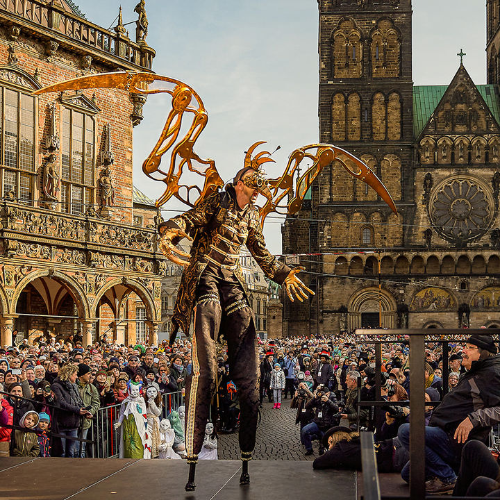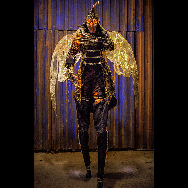 Diese Vogelgestalt ist der Magier unter den Stelzenfiguren. Halb Maschine, halb Flugwesen durchquert der elegante Pilot spielend Zeit und Raum und lässt seine mechanischen, goldenen Flügel im Licht erstrahlen.
