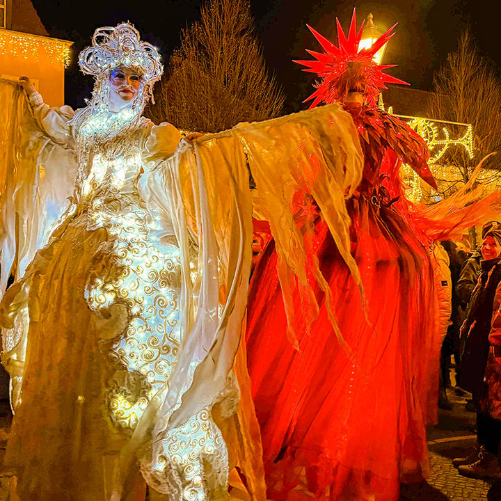 Ein Sternenträger und eine Sternschnuppenfrau sind die feurigen Wächter zwischen Himmel und Erde. Ihre dreidimensionalen Sternenkronen machen sie sehr weit sichtbar.